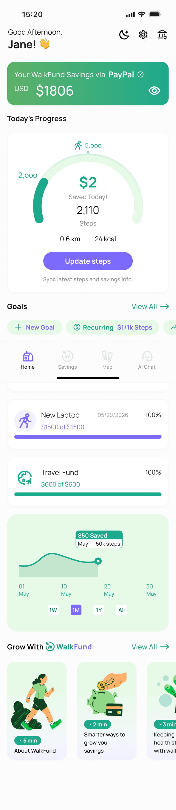 A saving product that turns daily steps into automatic savings tied to personal goals.