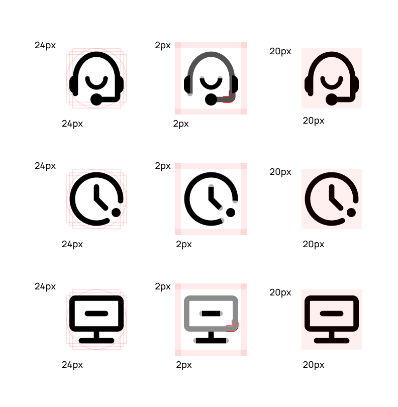 Icons are designed on a 24×24 grid with a 20×20 visual container.
