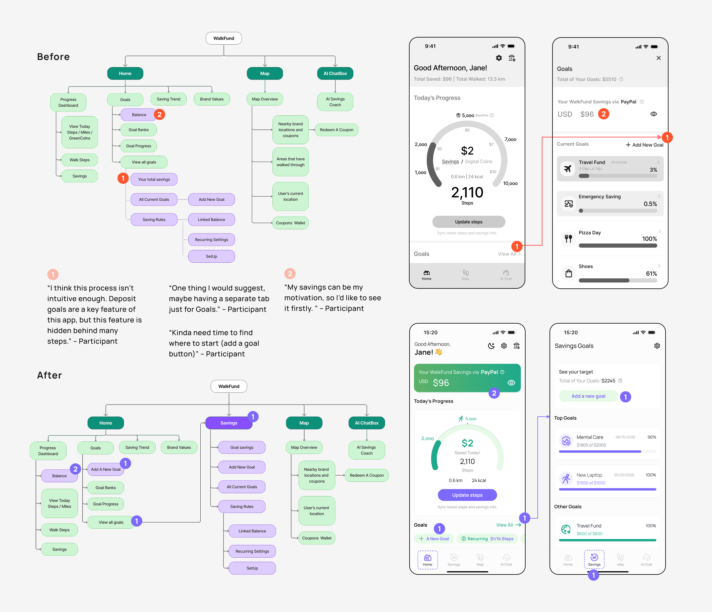 Then, I mapped journey to illustrate how WalkFund’s core features work together and why the MVP set effectively supports both finance-driven and lifestyle-driven users.