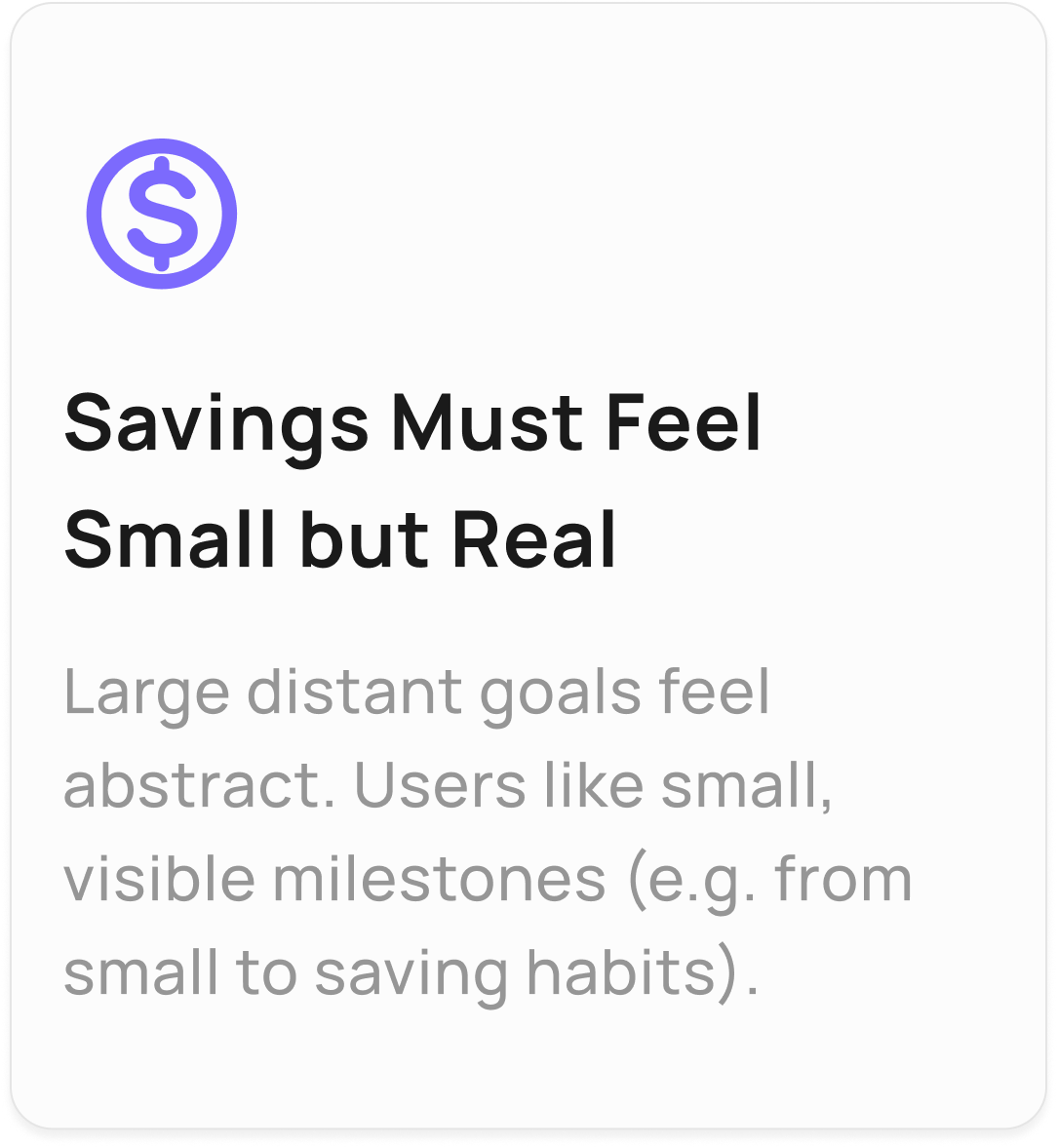 They said that saving is difficult to maintain. They want financial stability, but current tools and rewards don’t motivate them and feel disconnected from their real lives.