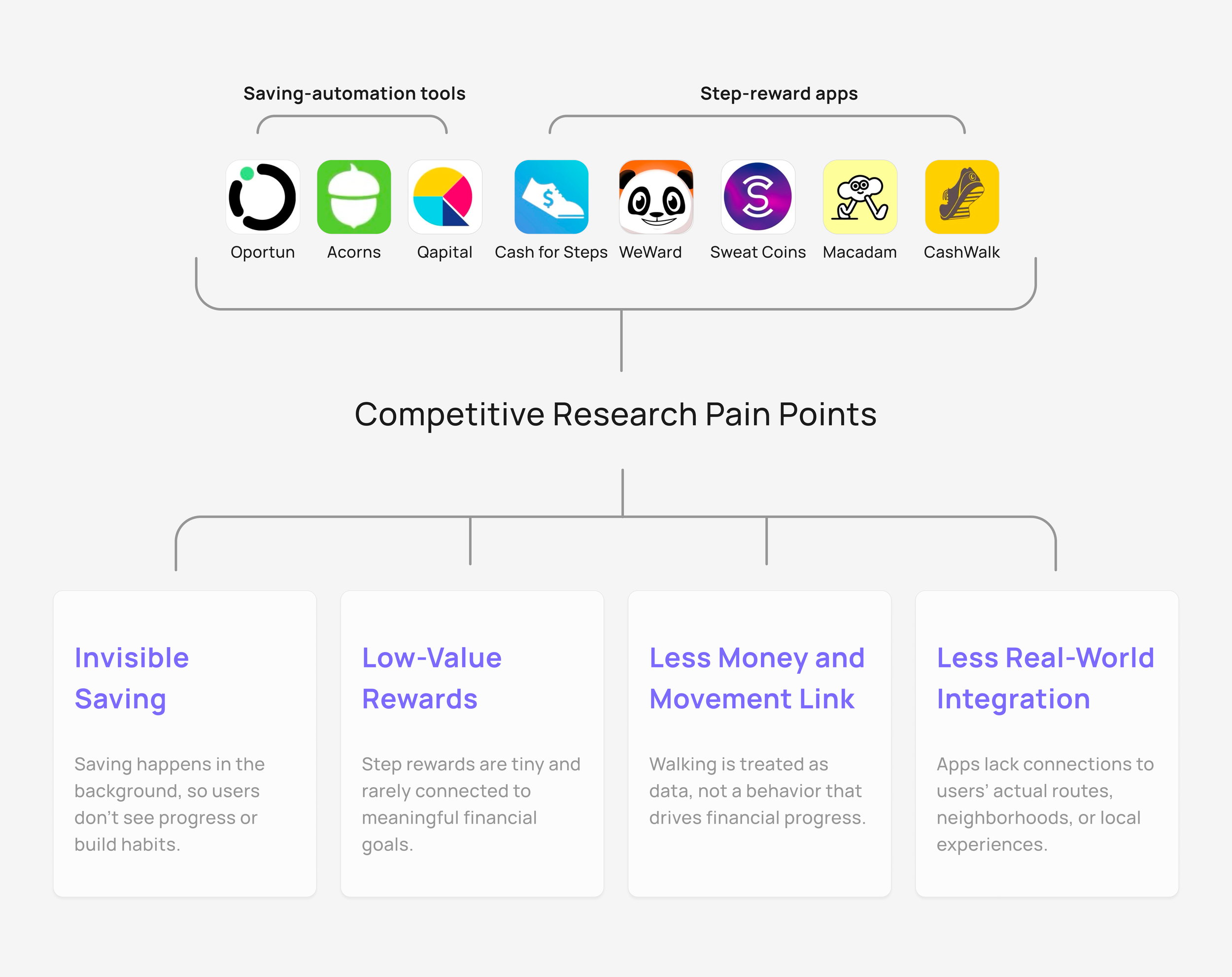 This leaves a clear gap for a walking-first approach that makes saving visible, meaningful, and lightweight for life.