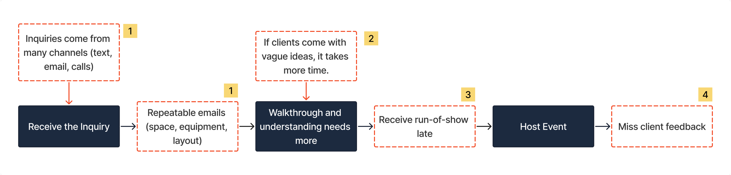 As event volume increased, WtC managed event rentals across emails, texts, phone calls, and Airtable, creating a complex coordination workflow.