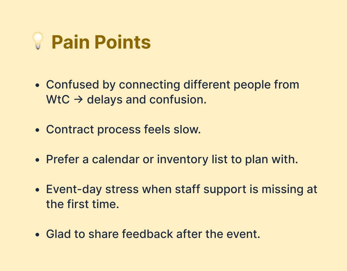 To ground the challenge, I conducted a 30-minute light talks with stakeholders to understand their current needs, business goals, and problems.