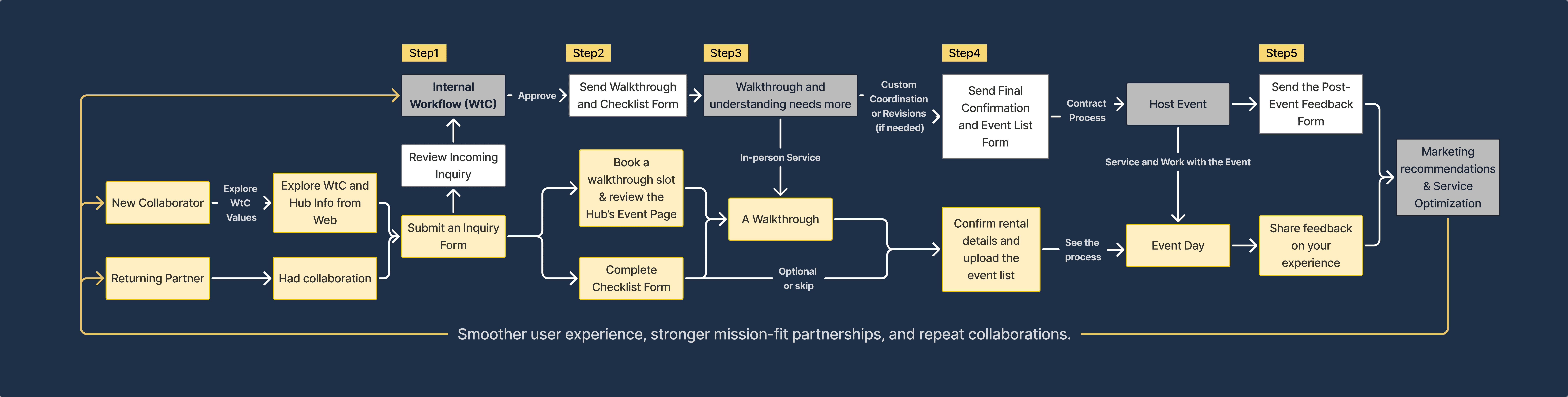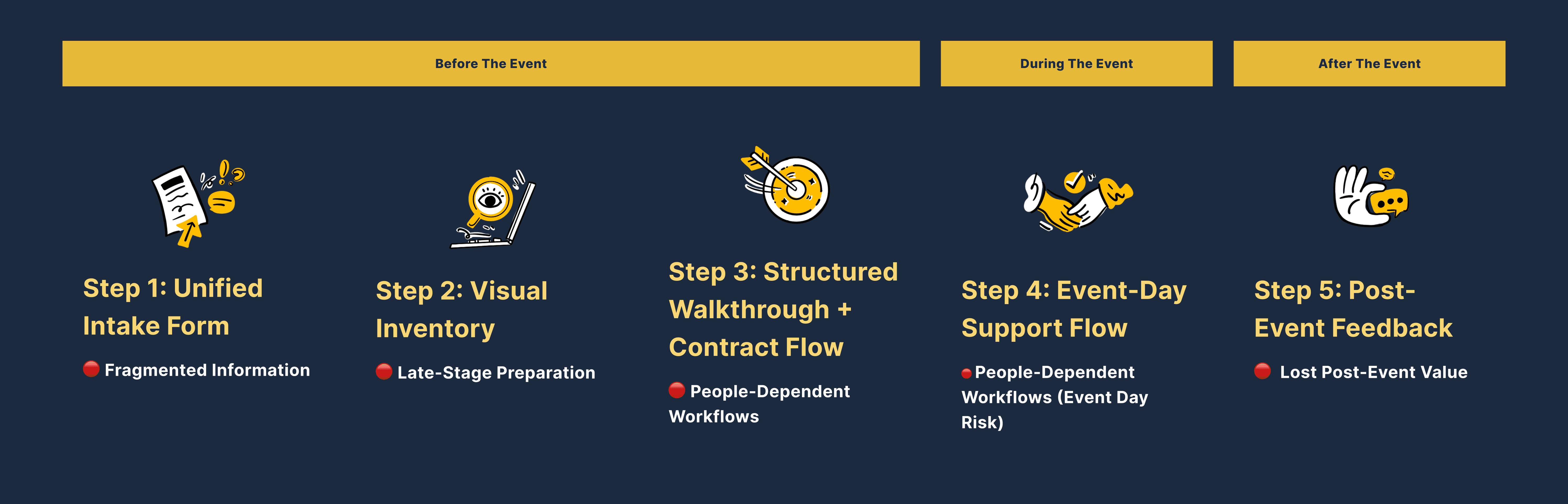 I proposed a 5-step rental system that front-loads clarity, reduces staff follow-ups, and creates a simple post-event learning loop.
