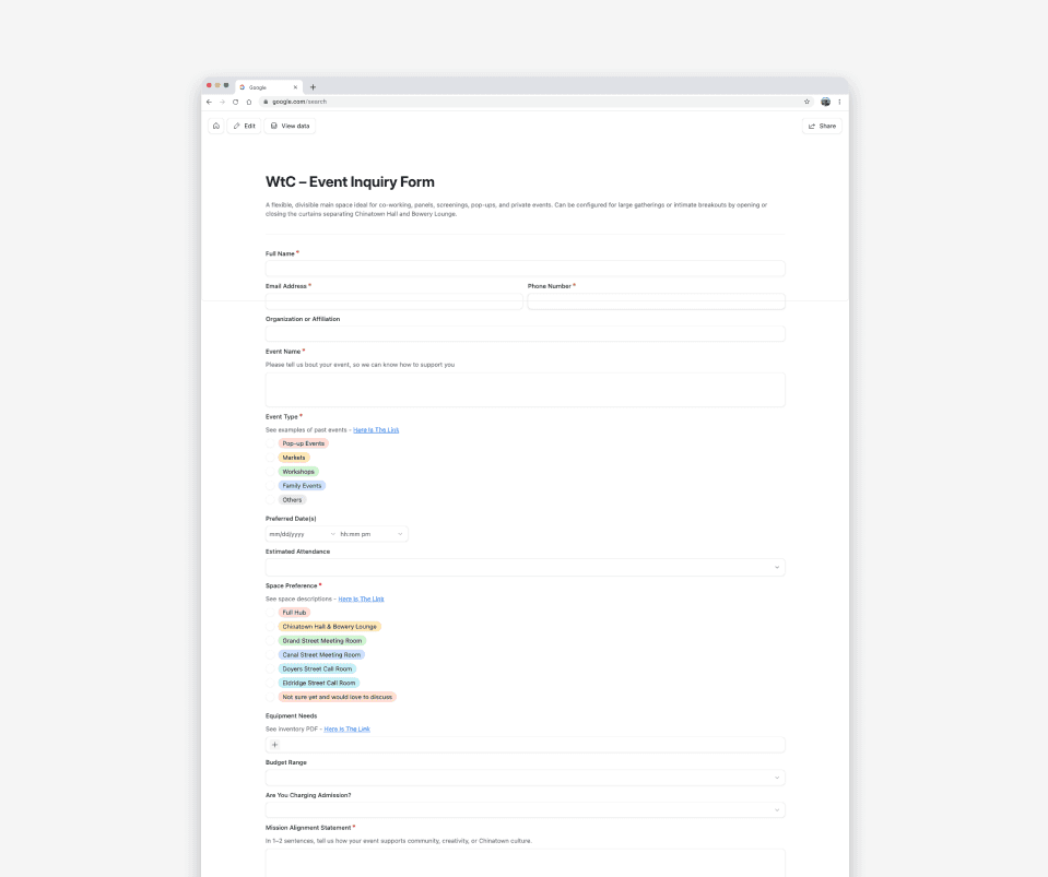 Welcome to Chinatown (WtC)’s event rental system evolved organically. As demand increased, coordination relied heavily on manual communication and individual memory. This created operational friction across three areas: